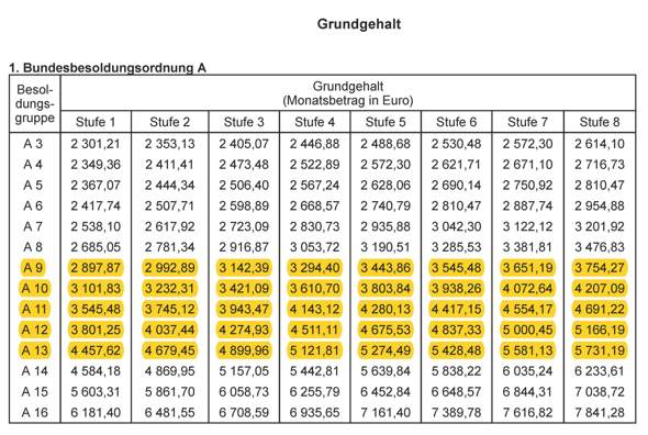 Wehrle Angestellte Lehrer verdienen bei gleichem Gehalt ca. Doch neben den Lehrern verdienen auch andere Beamtengruppen A13 nach der Besoldungsordnung A. Gehaltsrechner für den Öffentlichen Dienst Beamte Bund 2021 - PROGNOSE Besoldungsgruppe A 13 Stufe 3 Tabelle 01042021 - 31032022.